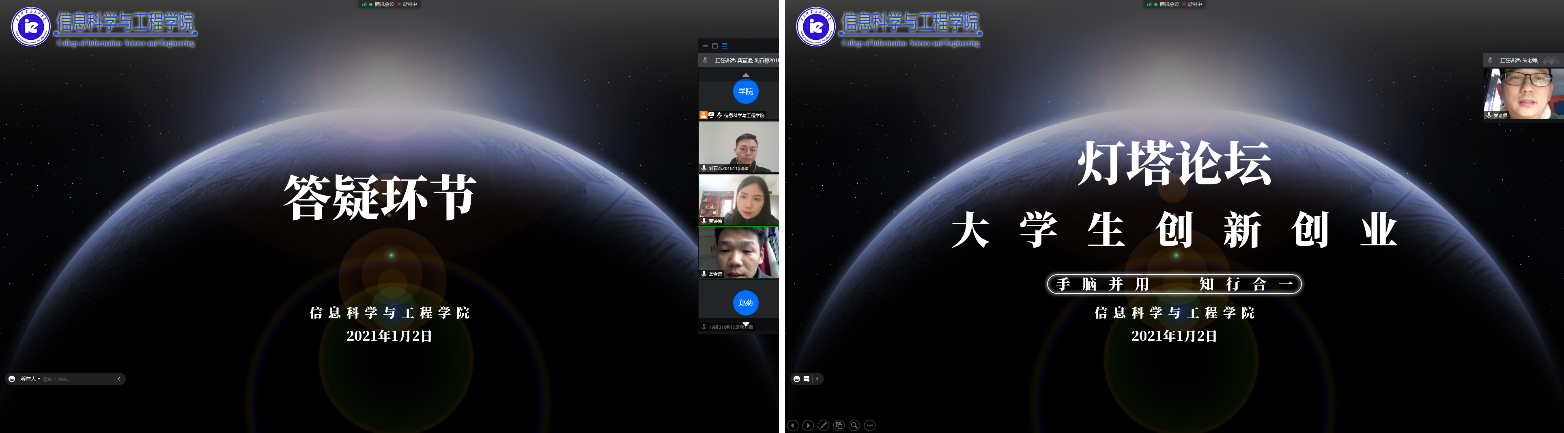 1月2日下午2点30至5点,金年会官网在腾讯会议APP开展线上“灯塔论坛”之“大学生创新创业”专场。学院党总支书记王杰文、副书记成夏炎、学工办主任关红儒和学工办李荣敬出席了会议,会议邀请了金年会官网的优秀校友龚宣运、贺诗娉、刘石奇进行经验分享和交流座谈。