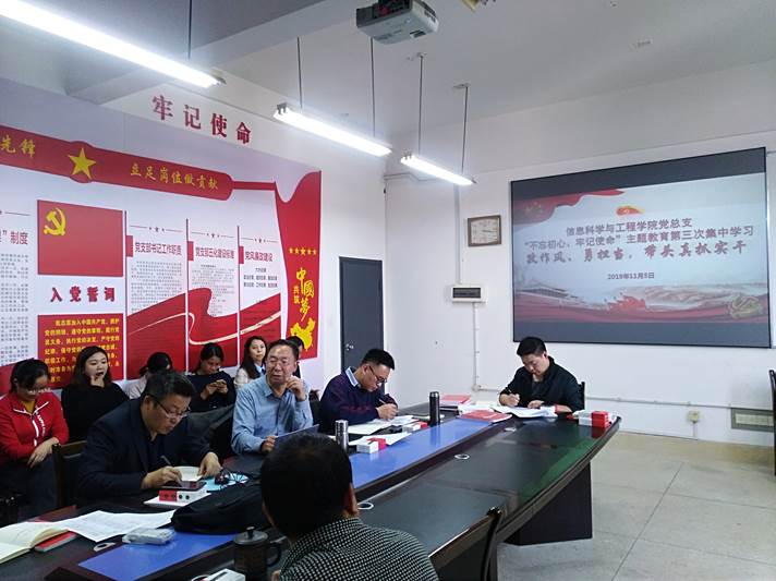 11月5日15时,信息科学与工程学院党总支部“不忘初心、牢记使命”主题教育第三次集中学习活动在玉衡楼北407举行。首先,党总支书记王杰文同志强调各党支部要结合“五化建设”,认真落实主题学习各项要求,组织党员对照党章党规按照“十八个是否”找准差距,检视问题,积极整改。随后,党总支副书记成夏炎同志围绕 “改作风、勇担当,带头真抓实干”作了主题发言,强调作为一名高校教育工作者,我们的初心与使命就是立德树人,为党育才,为国育人,也就是为培养中国特色社会主义的合格建设者和可靠接班人而努力。希望金年会官网全体教师居安思危,利用这次主题教育的机会,找准差距逐一落实,改作风、勇担当,带头真抓实干,成为一名传其以德,授之以学,解其之惑的合格教师。