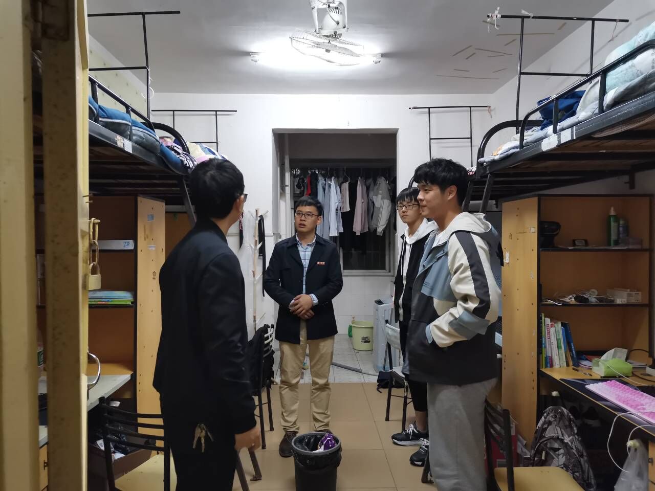 2020年10月27日下午六点整,金年会官网党总支书记王杰文教授、副院长田祖伟教授、何向阳教授、党总支副书记成夏炎博士带领辅导员和学生干部到4栋、11栋、12栋、13栋、14栋学生宿舍看望学生,检查寝室学风、文明卫生、内务整理,进行安全隐患排查;详细了解学生近期思想、学习和生活情况,从寝室环境、学习氛围、文明礼仪等方面进行宣传和教育引导。
