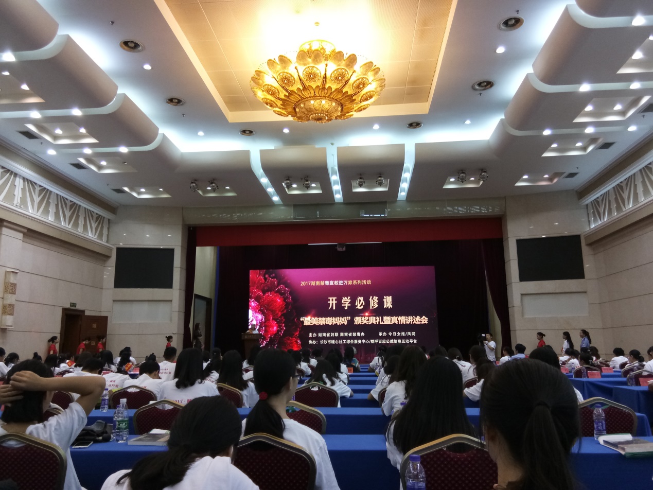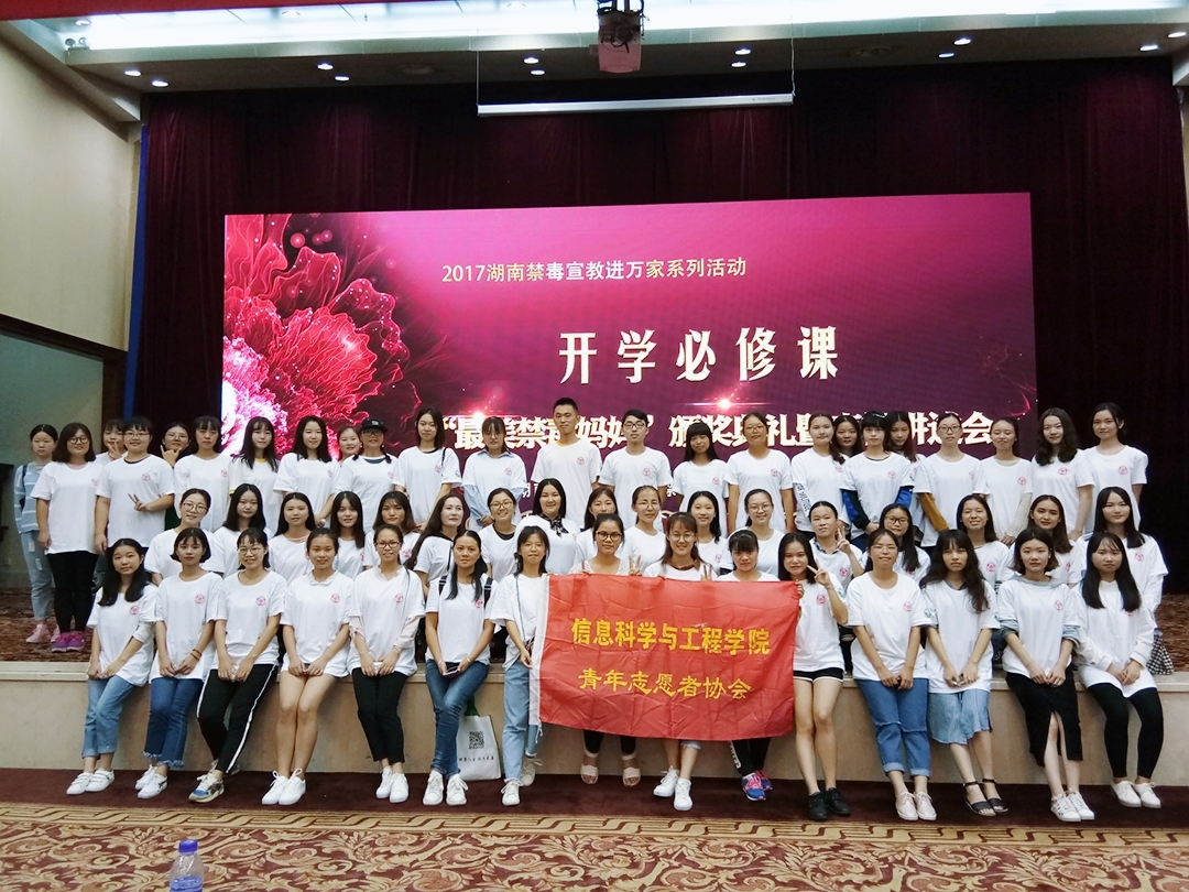 (通讯员 丁姣)2017年9月28日,信息科学与工程学院青年志愿者协会携48名志愿者在湖南宾馆二楼会议厅参加“最美禁毒妈妈”的颁奖典礼。本次活动由湖南省关工委指导,湖南省妇联、湖南省禁毒办主办,今日女报/凤网承办,有全国文明家庭、最美禁毒妈妈、妈妈禁毒志愿者、百余名高校大学生志愿者参与。活动意义重大,动员范围广,在多方力量的联动配合下取得了圆满成功!