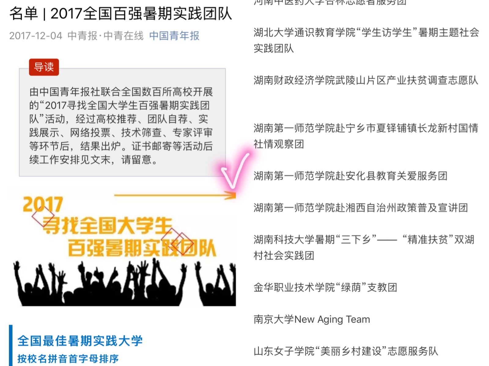 在团中央未来网启动的“奋斗中国梦·实践致青春2017年全国大中专学生暑期‘三下乡’新媒体公益传播力展示活动”中,金年会官网三下乡团队“赴安化县‘重走主席游学路’教育关爱服务团”成功入围“优秀团队”、“优秀报道”和“最美中国发现”奖项,学院辅导员唐瑞鸿入围“优秀指导老师”奖项。