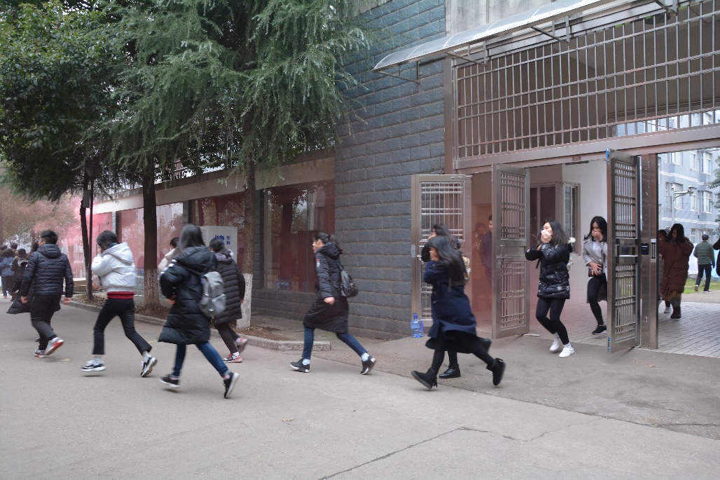 讲座后,为达到学以致用的效果,提高学生们应对火灾突发事件的自救能力,金年会官网于学生公寓12栋组织了一场应急疏散逃生演习。紧张的逃生警报一响,浓烟之中,在各工作人员的指导下,300余名学生1分钟之内快速有序地从“火灾”现场撤离,安全抵达田径场。