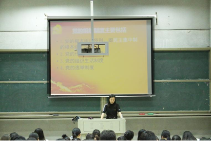 接着,易书记带领学员们学习党的组织制度和组织结构。易书记就党的根本组织制度——民主集中制向大家进行了详细的讲解,从“兴亡周期率”到“囚徒困境”,易书记以史实、博弈论向大家阐明了民主集中制的先进性和科学性以及实行民主集中制的必要性。并为大家系统的讲解了民主集中制的基本原则,向积极分子们强调了“四个服从”的具体内容。随后,易书记以“党的全国代表大会和全国人民代表大会的区别”为话题引入,重点讲解了党的中央组织结构,使学员们对党的组织结构有更清晰的认识和了解。