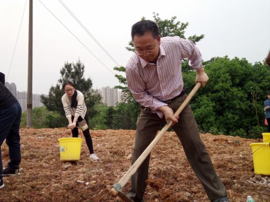 植树现场,学院党总支书记王杰文与老师同学们拿起铁锹、锄头热情地参与到植树活动中。同学们被领导老师的热情所感染,有的挥锹铲土,有的扶树填土,有的培土浇水,忙得不亦乐乎。王杰文书记一边用力地挥动着锄头一边向同学们传授着植树要领:“挖土下去那一下要使劲!土里面的石头要拣出来!”。经过将近一个小时的劳动,100多棵树在山坡上“安家落户”,为一师校园添上了一抹“信工绿”。虽然在植树过程中下起了雨,泥巴裹满了老师、同学们的裤腿,但是金年会官网师生仍然坚持完成了植树任务。
