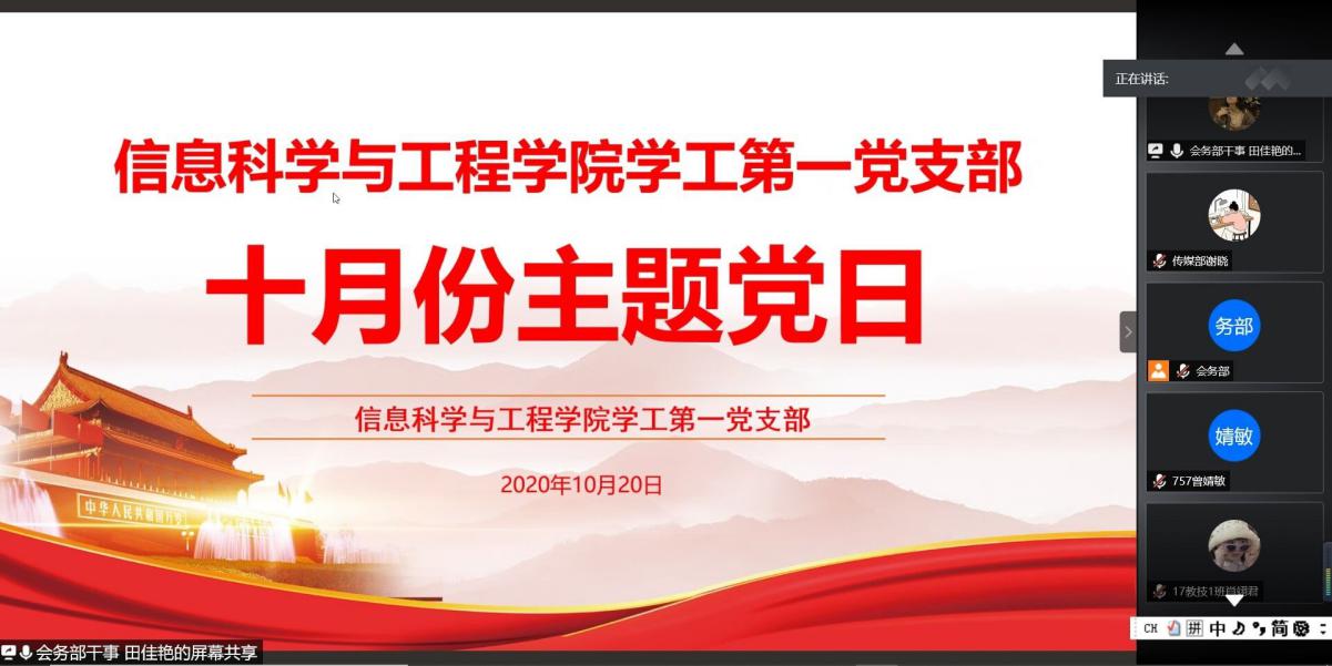2020年10月20日,金年会官网学工第一、第二党支部分别采取线上与线下结合的方式开展主题党日活动,活动由王丹、周应坚主持。金年会官网党总支副书记成夏炎、学工第一党支部书记关红儒、学工第二党支部书记李荣敬、学工办老师唐瑞鸿、叶晶以及部分学生党员参加此次活动。