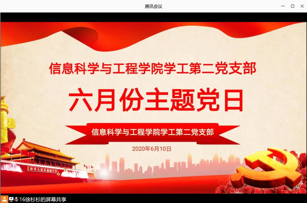 6月10日晚,金年会官网学工第一、第二党支部利用腾讯会议举行了六月份线上主题党日活动。金年会官网党总支副书记成夏炎、学工第一党支部书记关红儒、学工第二党支部书记唐瑞鸿、学工办老师叶晶、李荣敬以及全体学生党员参加活动。