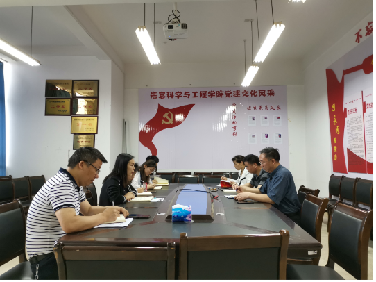 2019年5月30日上午9时许,信息科学与工程学院在院会议室召开意识形态工作研判会议。院党总支书记王杰文教授、副书记易利老师、副院长田祖伟教授、副院长王建军教授、党政办主任曾玢石老师、学工办主任关红儒老师和全体学工办辅导员老师参加会议。
