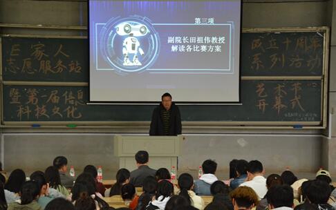 随后,王杰文教授回顾了E家人志愿服务站成立10年来开展的各项特色服务工作和收获的经验成果,并感谢每位老师和同学们的辛勤付出。另外,王教授在充分肯定了信工学子在往年技术精英竞赛季上出色表现的同时,鼓励同学们要再接再厉,积极踊跃地参与到信息科技文化艺术节的各项竞赛中,认真准备,全力以赴,切实做到“手脑并用,知行合一”,并寄语同学们要秉承以赛促学的初衷,提高对特色专业的知识应用能力。