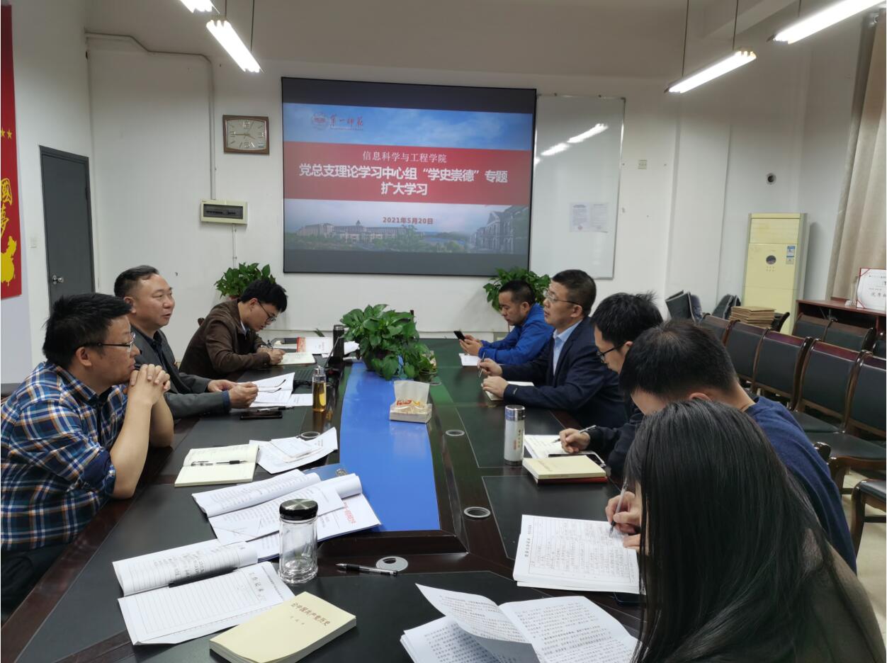 5月20日下午,学院党总支理论学习中心组在玉衡北407开展“学史崇德”专题扩大学习活动。学院领导、党总支委员及金年会官网学校第二次党代会代表参加。活动由党总支书记王杰文主持。