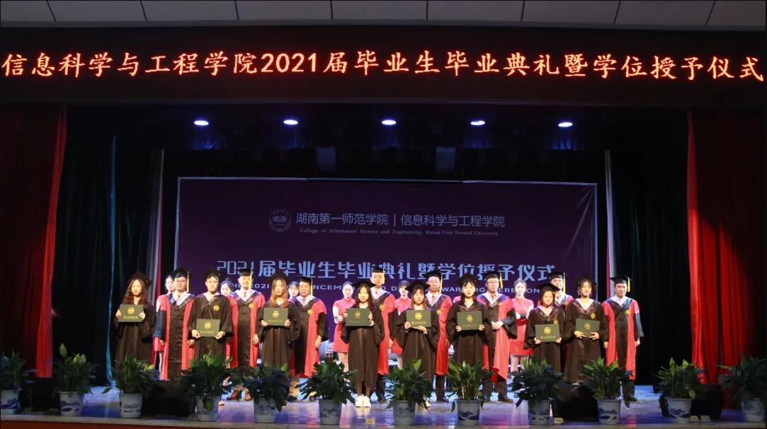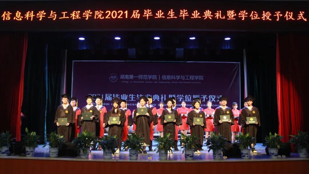 8时57分,现场人员全体起立,在热烈的掌声和激昂的校歌声中,学院领导及教授代表进入会场并入座。9时许,全体人员庄严肃立,高唱国歌,信息科学与工程学院2021届毕业生毕业典礼暨学位授予仪式正式拉开序幕。