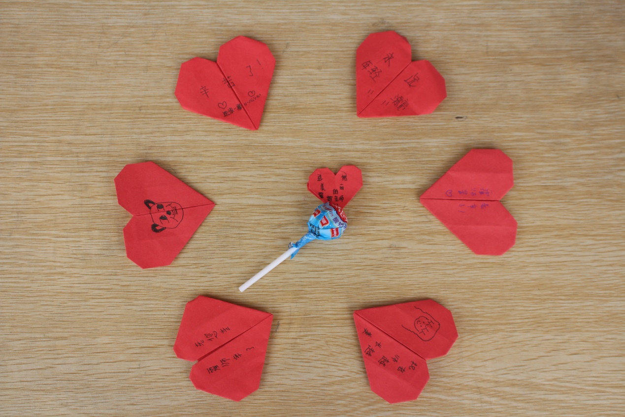 图为小朋友们将自己折的红心和糖果送给老师,红心和糖果进行合影留念。通讯员 段新利 摄