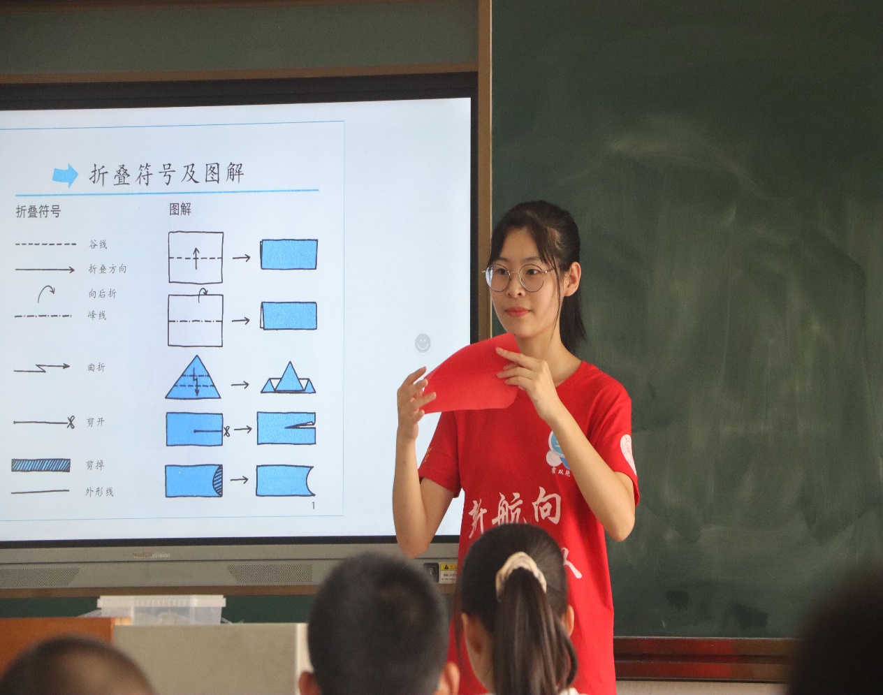 图为“红心向党”趣味手工课老师示范红心折纸步骤,老师正在对折红色卡纸。通讯员 段新利 摄