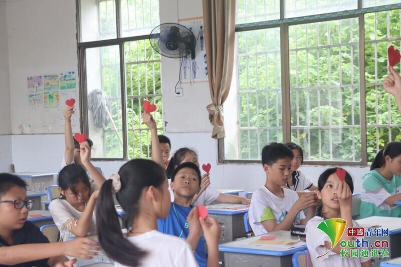 图为孩子们热情地向志愿者展示折好的红心。中国青年网通讯员 欧阳健 摄