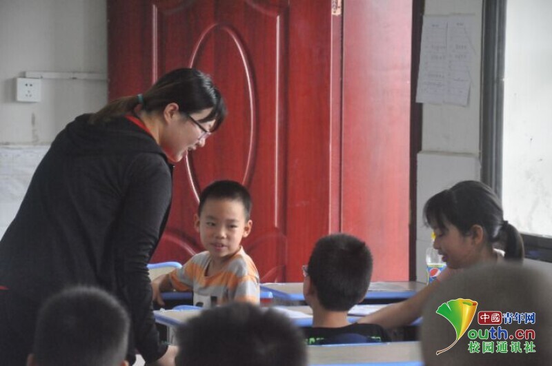 图为趣味英语课上新航向·梦之队志愿者开心地与班级同学交流互动。中国青年网通讯员 欧阳健 摄