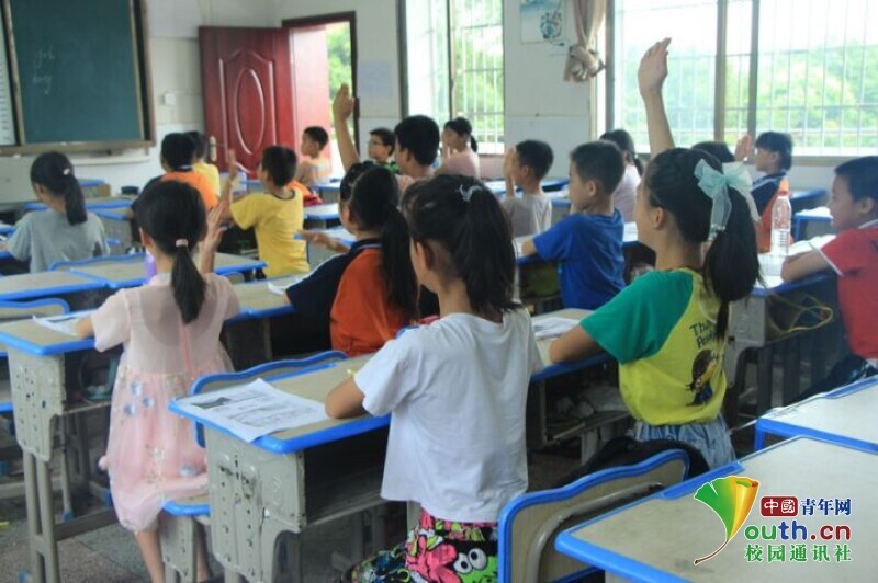 图为趣味英语课上孩子们积极举手发言,分享自己的答案。中国青年网通讯员 何星逸 摄