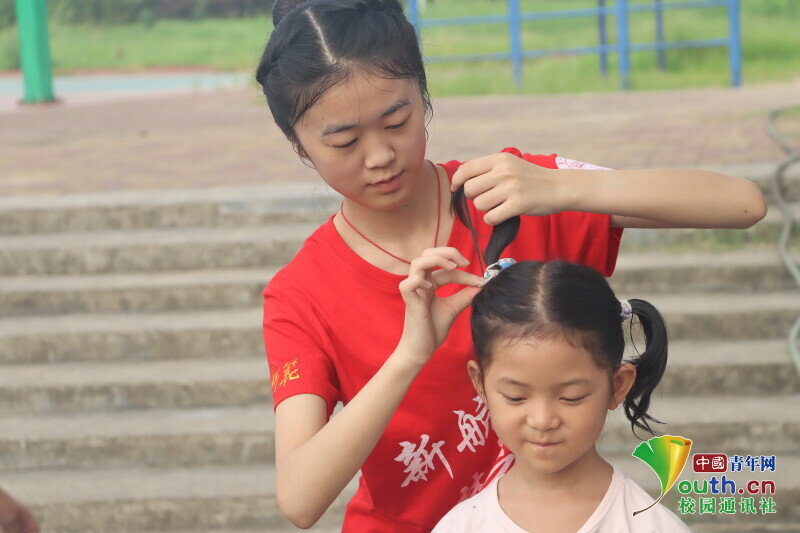图为志愿者课间弯腰给孩子扎头发的场景。中国青年网通讯员 段新利 摄