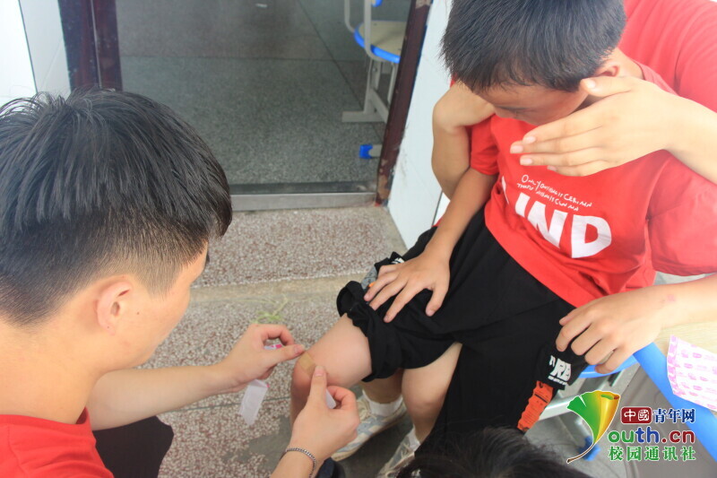 图为孩子摔跤后志愿者在为其贴创可贴的场景。中国青年网通讯员 段新利 摄