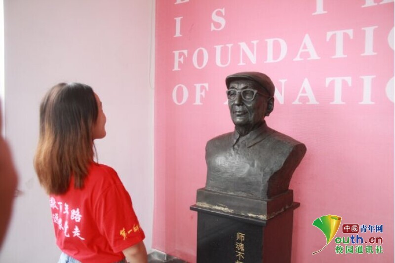 图为新航向·梦之队队员与张国基老先生铜像的对视,两代教育者之间的交流。中国青年网通讯员 欧阳健 摄