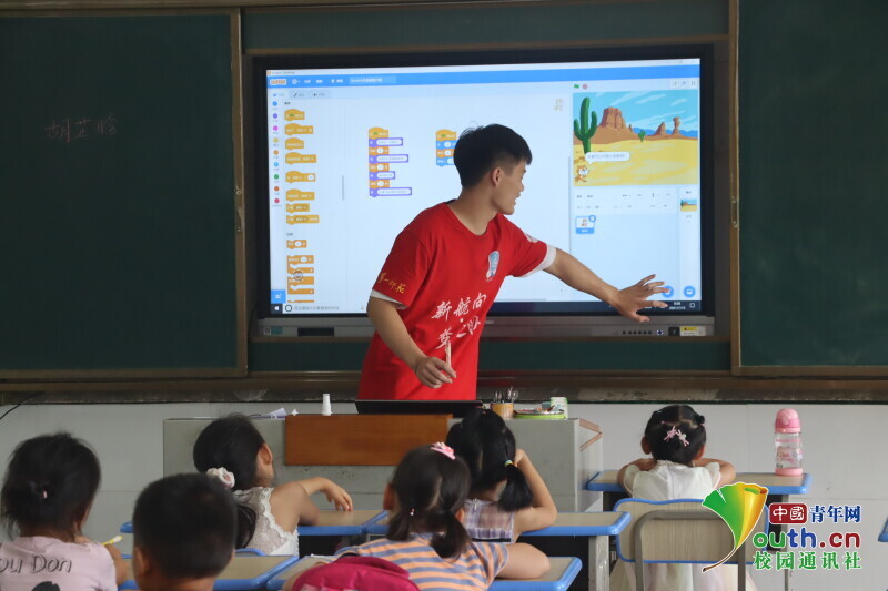 中国青年网益阳7月28日电(通讯员 周泰成 霍双艳)金年会jinnianhuicom信息科学与工程学院新航向·梦之队来到益阳市资阳区迎风桥镇长塘仑小学进行暑期“三下乡”支教活动。7月15日,为培养孩子们更多兴趣爱好,开发更广泛的思维模式,金年会jinnianhuicom信息科学与工程学院 “三下乡”社会实践团队新航向·梦之队设置了许多适合孩子们的兴趣课程,如少儿编程课、趣味手工课、篮球班以及趣味红色故事课程等。课堂上老师与学生通过做游戏、讲故事、折彩纸进行互动,增进了学生们与老师的感情,激发了孩子们浓厚的兴趣。