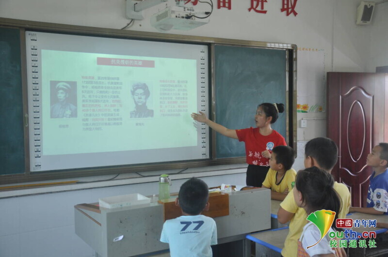 图为志愿者老师与学生在红色趣味故事课上一起了解“抗美援朝”英雄的红色故事。中国青年网通讯员 段新利 摄