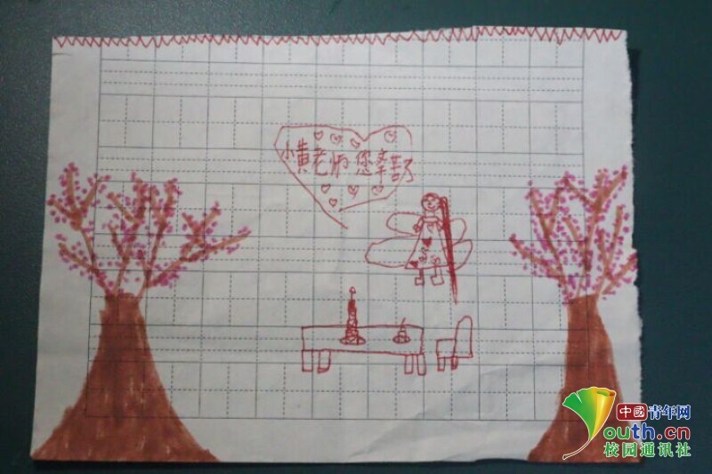 图为一名同学送给她的班主任小黄老师的留言条和图画。中国青年网通讯员 段新利 摄