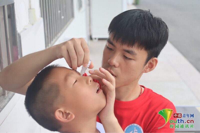 图为趣味英语课后,学生告知老师自己眼睛不舒服,志愿者老师耐心地询问原因,了解情况后,小心翼翼地为其滴眼药水。中国青年网通讯员 欧阳健 摄