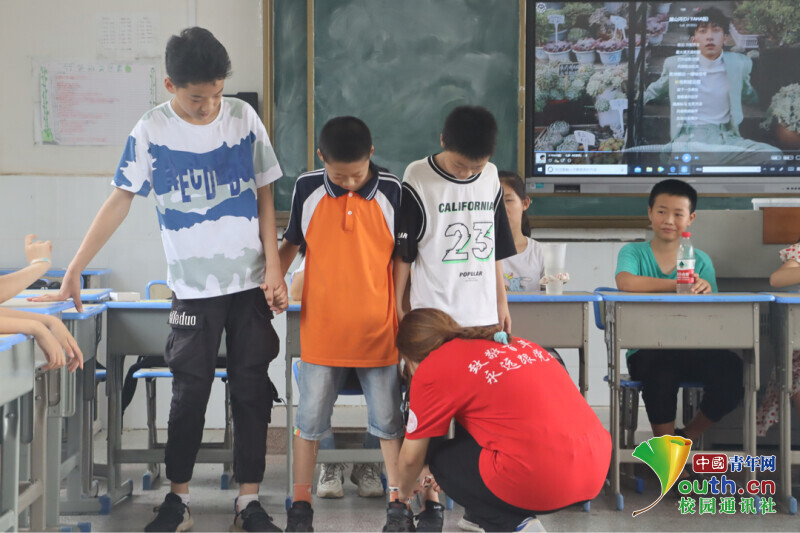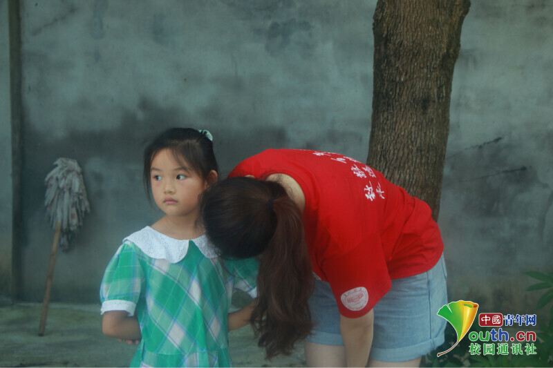 图为体育课上学生小爱的头发不小心松散,志愿者老师立马给扎起了双马尾,大汗淋漓。中国青年网通讯员 欧阳健 摄