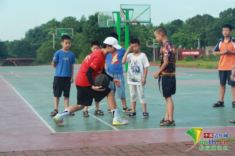 图为志愿者向学生展示正确的运球姿势。中国青年网通讯员 何星逸 摄