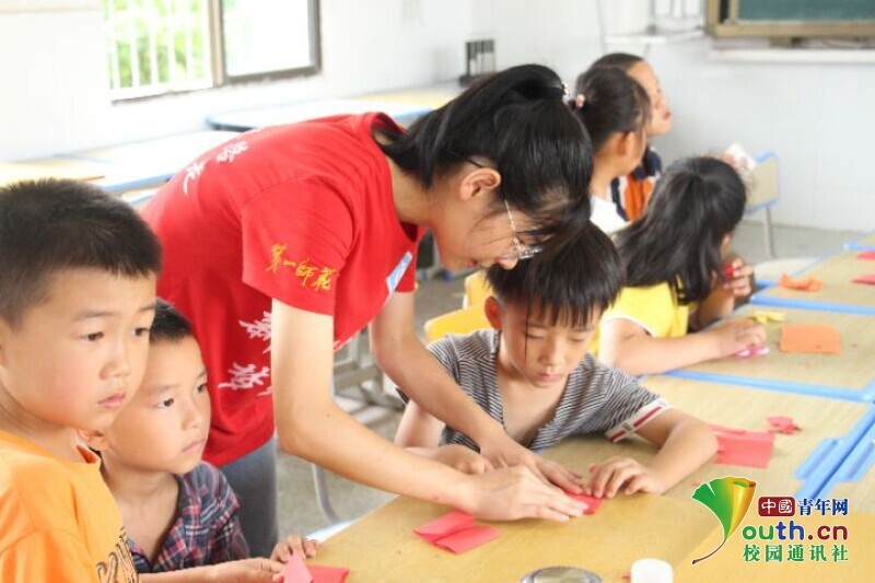 图为负责趣味手工课程教学的队员正在手把手教同学们折红心。中国青年网通讯员 欧阳健 摄