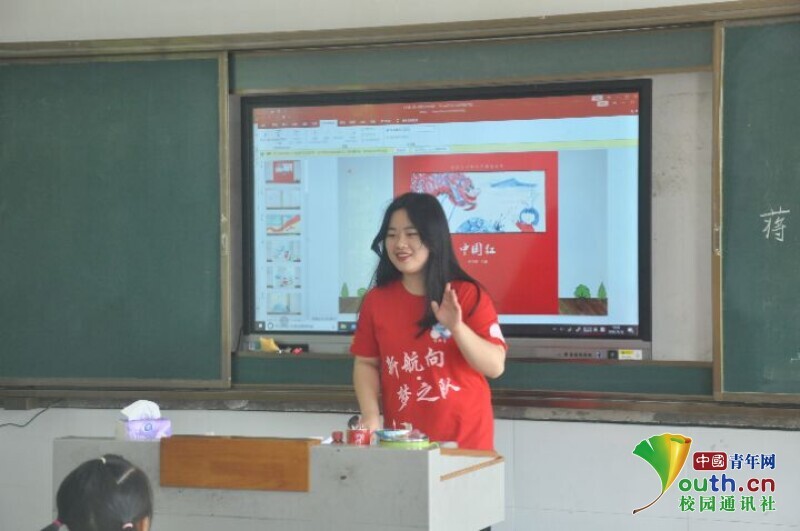 图为负责红色趣味故事课程教学的队员正在给同学们上《中国红》的课。中国青年网通讯员 欧阳健 摄
