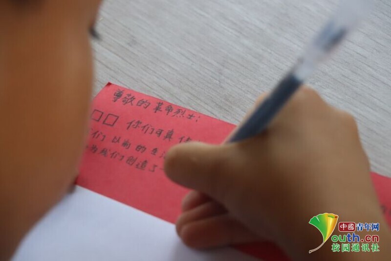 图为一名同学正在写一封给革命烈士的信。中国青年网通讯员 欧阳健 摄