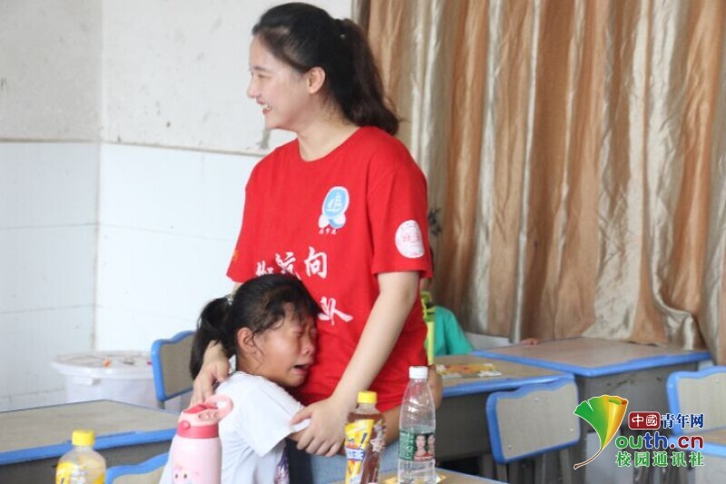 图为一名同学抱着老师哭泣着不舍得老师离开。中国青年网通讯员 欧阳健 摄