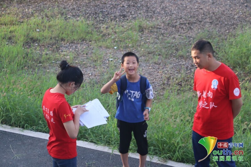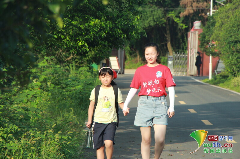 图为 新航向·梦之队队员手牵手带领孩子走进校园。中国青年网通讯员 何星逸 摄