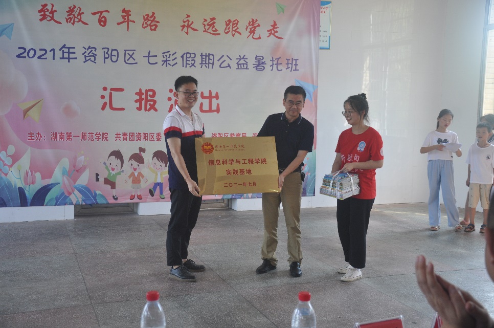 演出开始前,王杰文和谭莹分别作了讲话。他们充分肯定了实践团在迎风桥镇所开展的社会实践活动,高度赞扬了带队老师和队员的精心组织和辛勤付出,衷心感谢了组织方和实施方的鼎力支持。随后,成夏炎代表学院向迎风桥镇中心学校罗立强递交了“实践基地”牌匾,并捐赠了价值3000余元的图书资料。