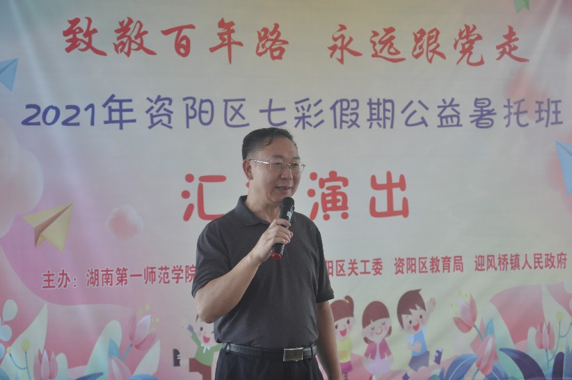 7月23日上午,由金年会官网“三下乡”社会实践团举办的“致敬百年路,永远跟党走”文艺汇演在长塘仑小学举行。莅临演出现场的领导和嘉宾有迎风桥镇党委书记谭莹,镇党委副书记、镇长肖博,团区委书记曾晴阳,迎风桥镇中心学校校长罗立强,长塘仑小学校长黄小毛,学院党总支书记王杰文,副书记成夏炎,党总支委员、副院长田祖伟,副院长何向阳,党总支委员、学工办主任关红儒,团总支书记、团队带队老师李荣敬。