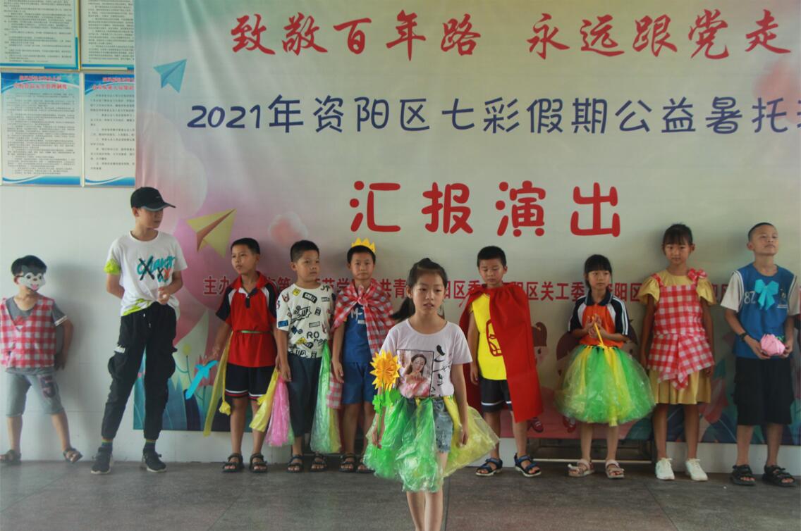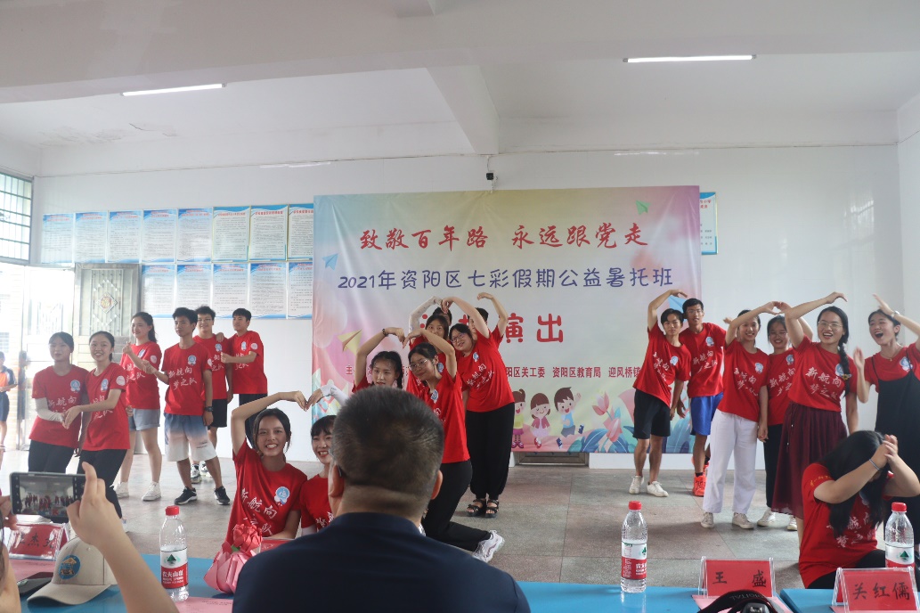 9时10分,文艺汇演正式开始。演出分设“美好假期”“建党光辉”“E想天开”“后会有期”四个篇章,精心编排了9个节目,篮球、音乐、舞蹈、朗诵、手工、手语6个兴趣班学生与支教队员们通过红歌演唱、朗诵、手舞、合唱等形式,将学习内容融入表演中,展示着近半个月的实践成果。节目中,小朋友们自信、大方,精彩认真而富有深情地演绎着自己这十余天的收获,赢得了在场领导和家长的阵阵掌声。演出在领导老师和孩子们的合影中落下帷幕。