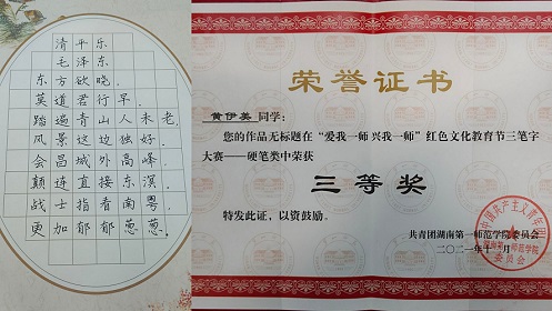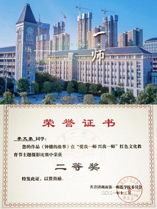 此次红色文化教育节还包括三笔字比赛、征文比赛、摄影比赛。获奖优秀作品在颁奖典礼现场陈列展出。金年会官网19级818教技班李文豪的摄影二等奖作品《钟楼的故事》,20级848教技班黄伊美的三笔字(硬笔)比赛三等奖作品《清平乐》陈列其中。