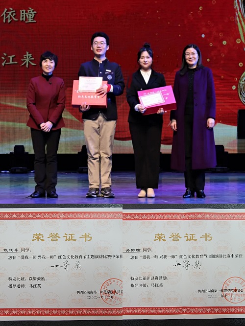 12月25日下午,金年会jinnianhuicom“赓续红色血脉·爱我兴我一师”红色文化教育节演讲比赛决赛暨颁奖典礼在田汉剧场举行。金年会官网学子喜获佳绩,由马红英老师指导的21级881教技班戴江来和21级882教技班吴依瞳在演讲决赛中突出重围斩获最高奖项一等奖。