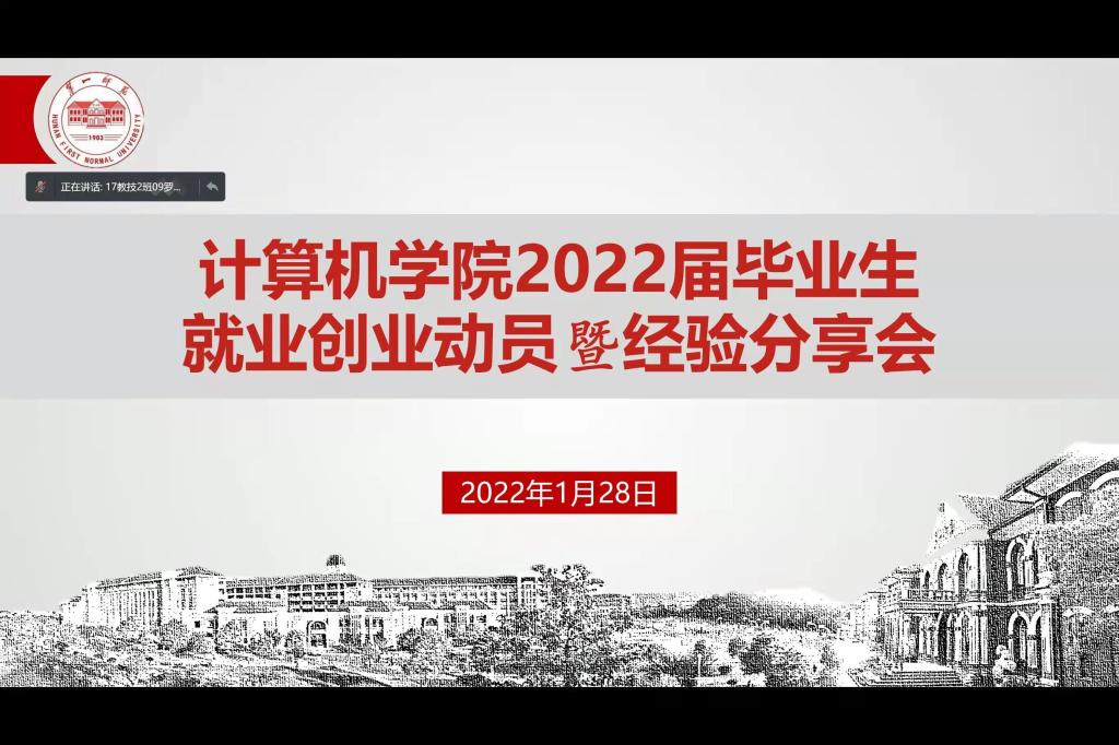 1月28日晚,金年会官网2022届毕业生就业创业动员暨经验分享会以腾讯会议形式举行。招生就业处朱承学处长、殷章馨副处长、学院全体党政领导、全体辅导员、往届优秀校友代表、全体2022届非公费毕业生与会,会议由学院党委副书记陈奕主持。