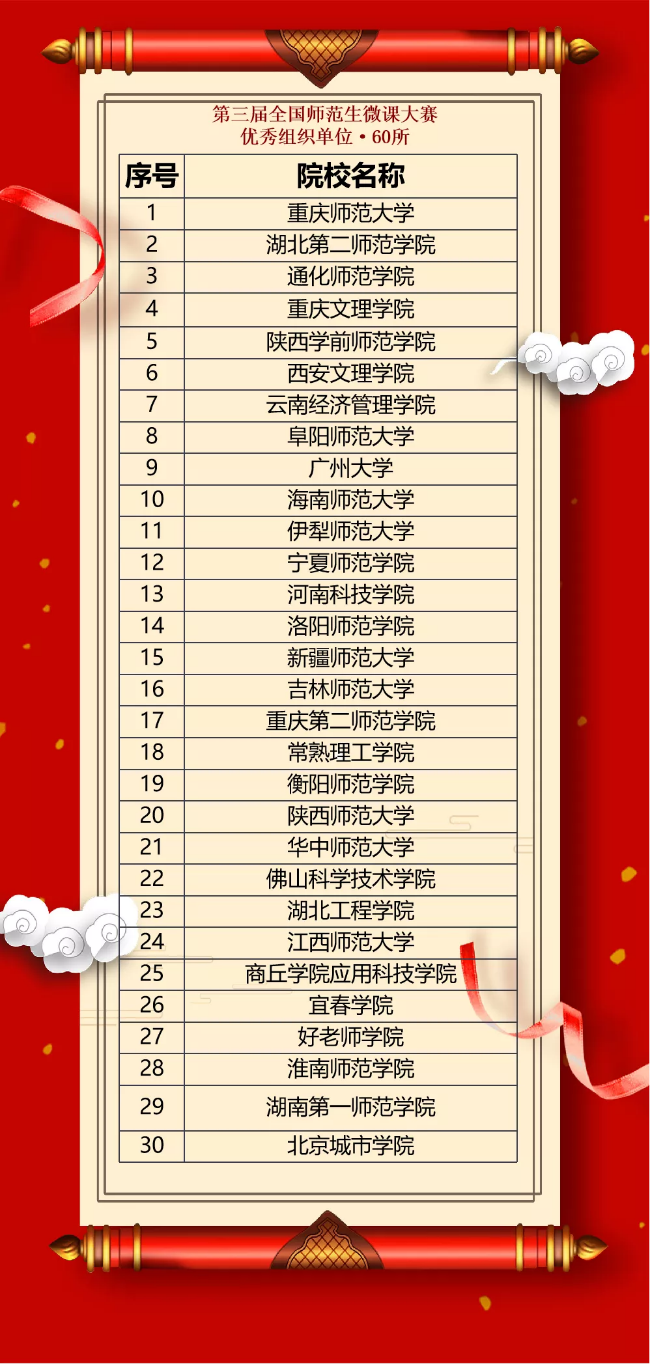 全国师范生微课大赛是目前规模较大、覆盖面较广、师生参与人数较多的国家级大学生赛事。本届大赛经各院校初赛推选,共收到127所院校1987项作品,经过网络评审、专家评审,最终评审出特等奖101项、一等奖199项、二等奖398项、三等奖500项,优秀组织院校60所,93位老师被评为优秀指导老师。