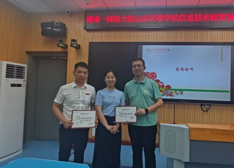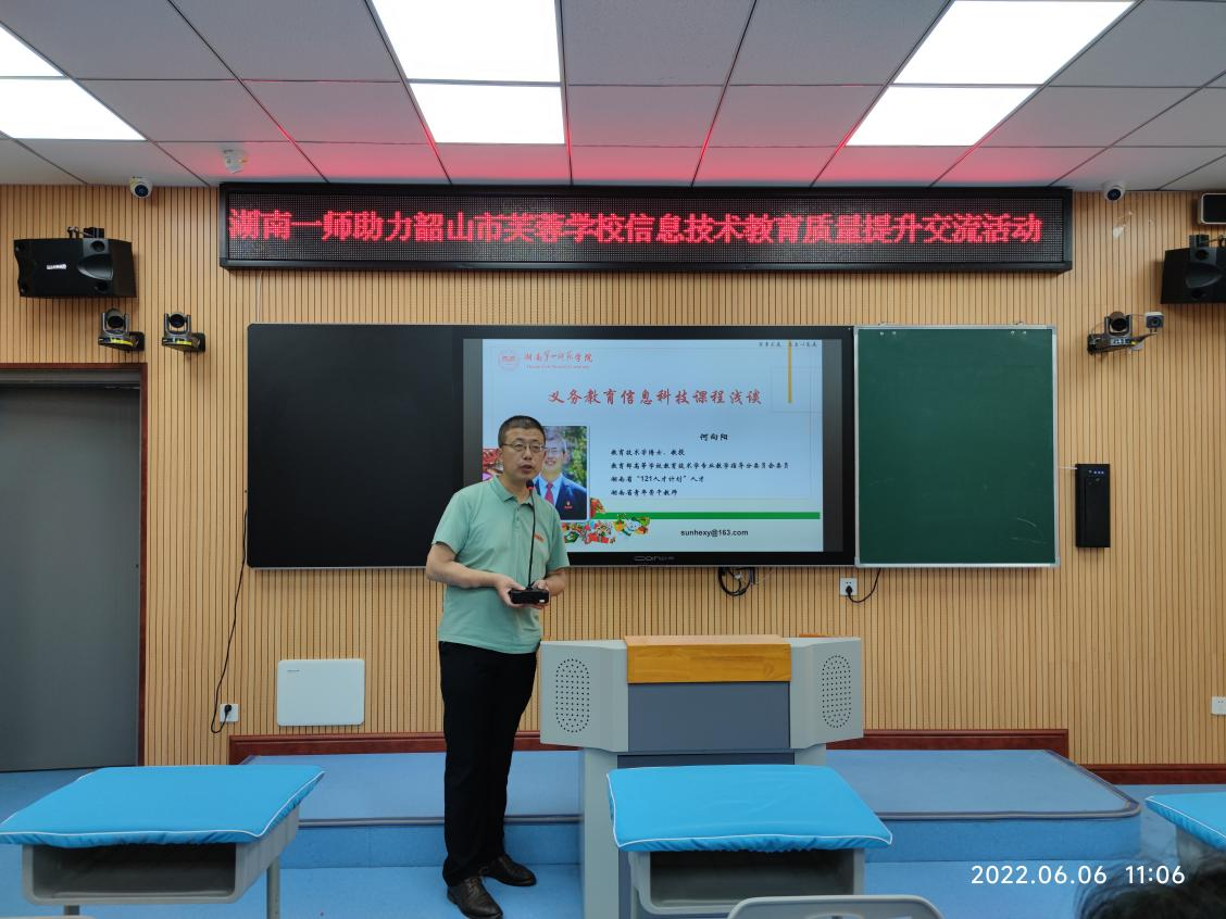 为提升芙蓉学校教育教学质量,实现城乡教育均衡发展,充分发挥金年会官网在基础教育领域的引领示范作用,实现优质资源共享,2022年6月6日,金年会诚信信誉至上副院长何向阳带领由教育技术学专业教学论团队成员、长沙市天心区青园小学教师龚宣运、湖南一师第一附属小学教师曹向荣组成的教育技术学帮扶团队,前往韶山市芙蓉学校开展信息技术教育质量提升交流研讨活动。此次活动由韶山市芙蓉学校校长李冬文主持,芙蓉学校全体行政、综艺组全体教师,韶山市各小学信息技术教师代表等参加了此次活动。
