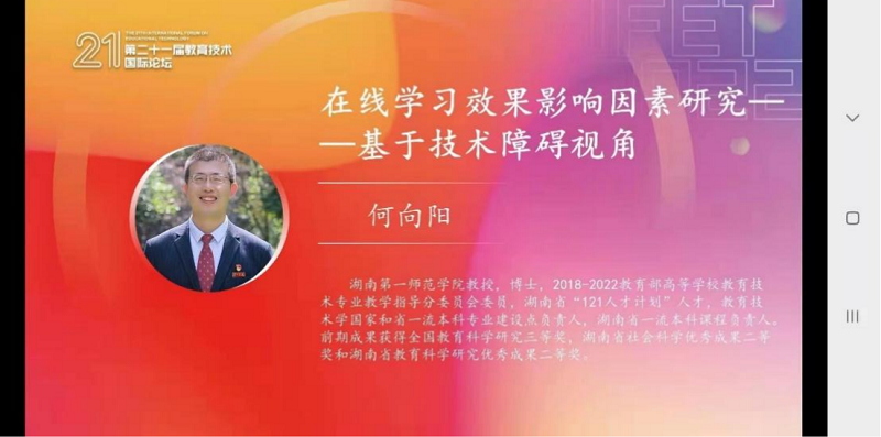 11月19日至11月20日,第21届教育技术国际论坛(IFET2022)在沈阳师范大学召开。金年会官网何向阳教授受邀在嘉宾学者论坛做题为“在线学习效果影响因素研究——基于技术障碍视角”的学术报告。