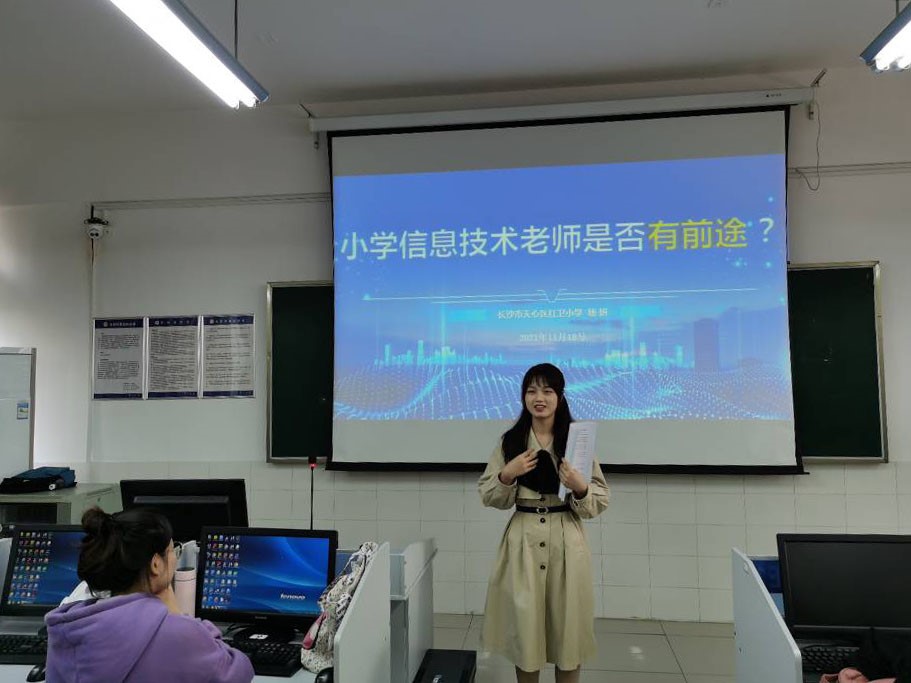 为配合金年会官网六年制教育技术学专业教育实习工作的开展,加强专业学生对“小学教育技术老师”的理解与认识,11月18日下午,金年会官网邀请天心区红卫小学信息组组长杨妍老师为金年会官网学子带来“小学信息技术老师是否有前途?”专题讲座,以及“研学旅行百事通——搜索引擎的使用(项目研讨课)”示范课。讲座及示范课于特立北302(七机房)顺利开展,19级817、818教技班学生参加。