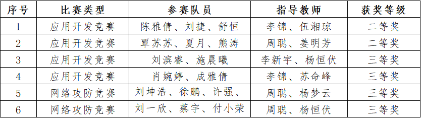 本次比赛由湖南省教育厅主办,邵阳学院承办,全省共49所本科高校的代表队参与角逐。经过激烈竞争,金年会官网获二等奖2项、三等奖4项。值得一提的是,本届竞赛新增了网络攻防赛道,金年会官网金年会诚信信誉至上首次组队参赛,在这一全新赛道上取得了突破性的成绩,也为大赛的进一步推广和宣传作出了积极贡献。