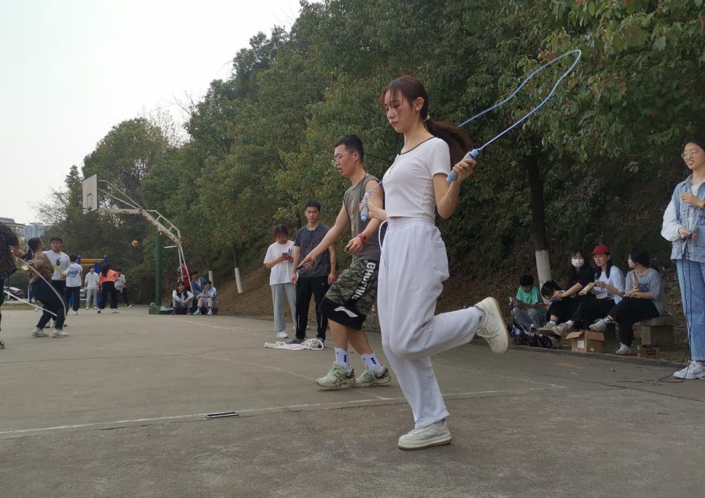三分钟集体八字跳绳也开始进行,哨声一响,每位同学为了争取班级荣誉,使出浑身的解数,只见绳子在他们的脚底下“嗖嗖”地穿过,选手们都表现出了不凡的实力。一个个卯足了劲儿,让在场观众刮目相看。参加长绳比赛的摇绳的同学抡着手臂,尽量配合着跳绳的同学。“没关系,再来再来”这是他们每次没跳过去时说得最多的句子。同伴之间的互相鼓励成为了大家坚持下去动力。最终,21级881教技班凭借团队的默契配合获得了此项比赛的第一名,其他班级的参赛队伍也取得了优异的成绩。
